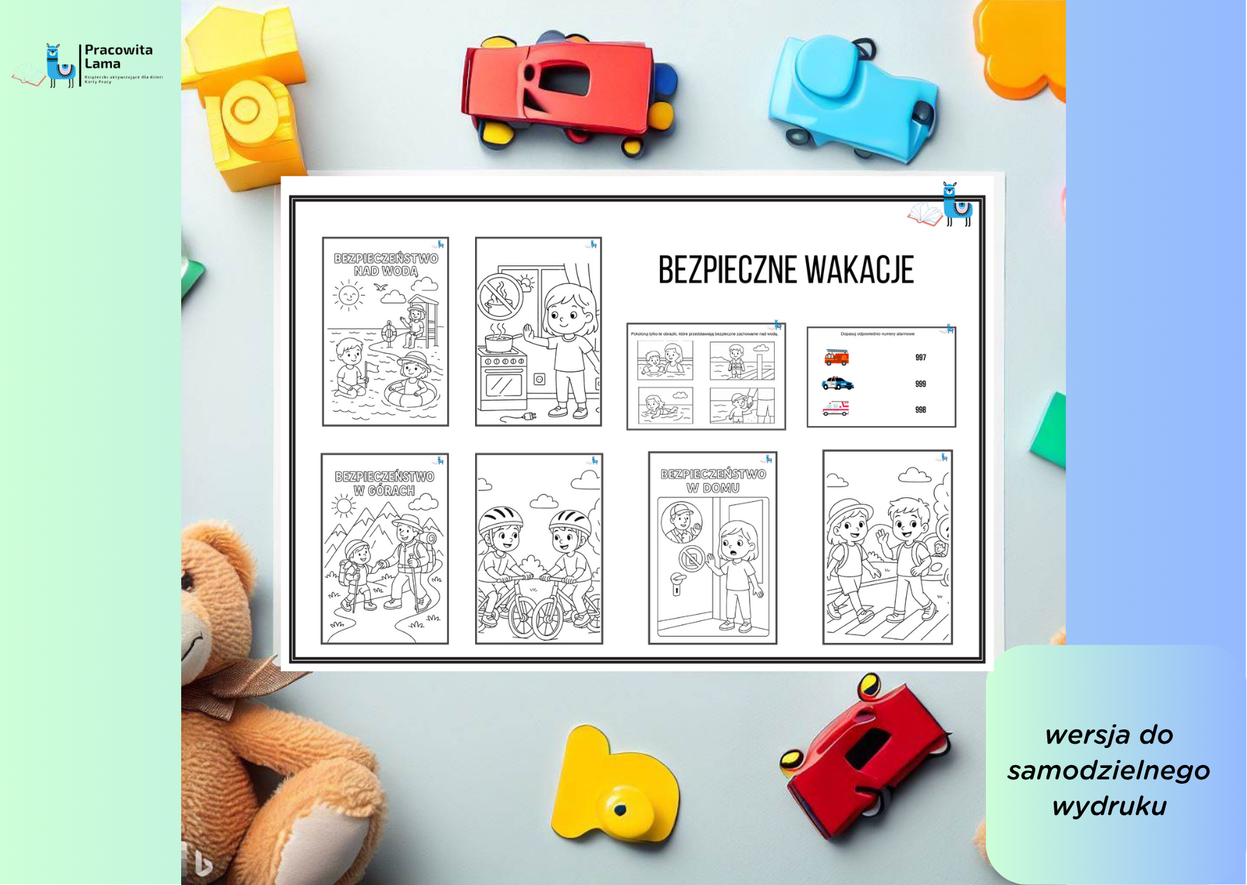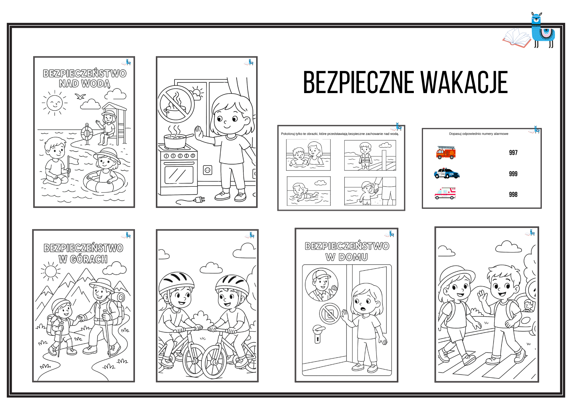 - 10 kolorowanek związanych z bezpieczeństwem: nad wodą, w górach, na drodze, w domu