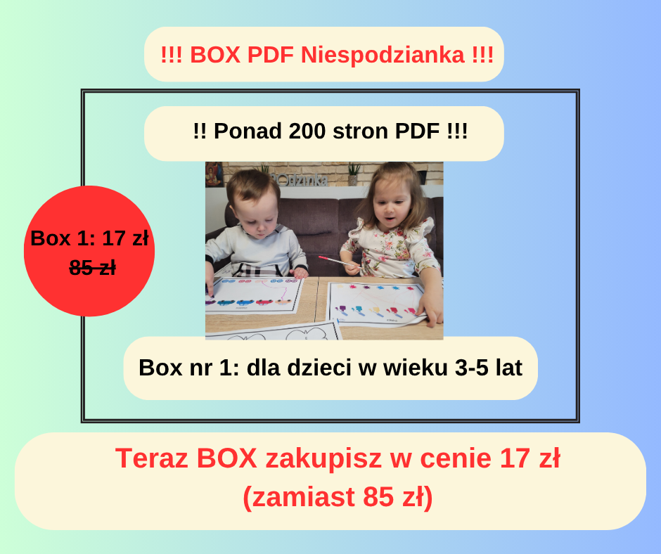 W tym BOX-ie otrzymasz ponad 200 stron materiałów PDF z zadaniami przeznaczonymi dla dzieci w wieku 3-5 lat.