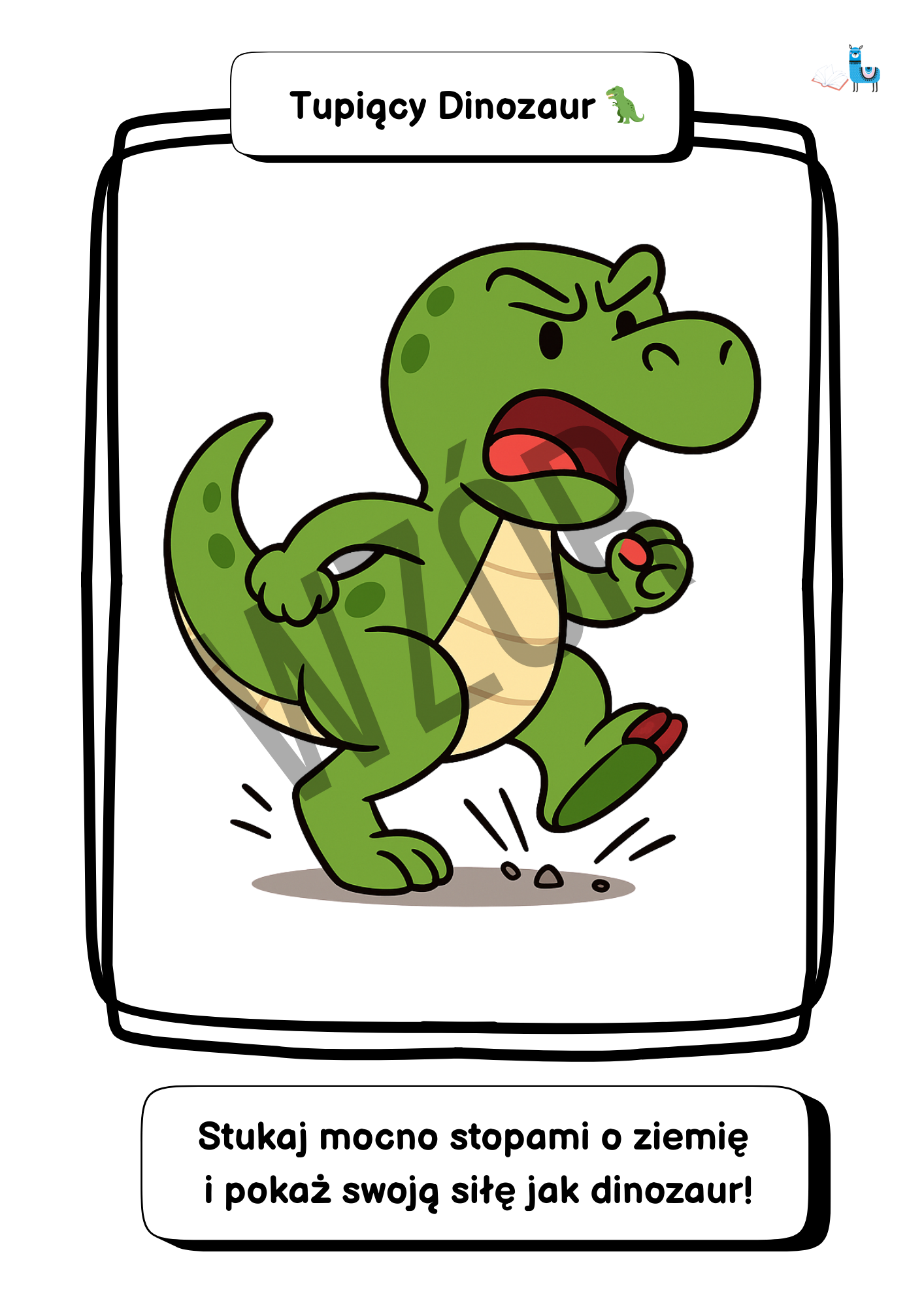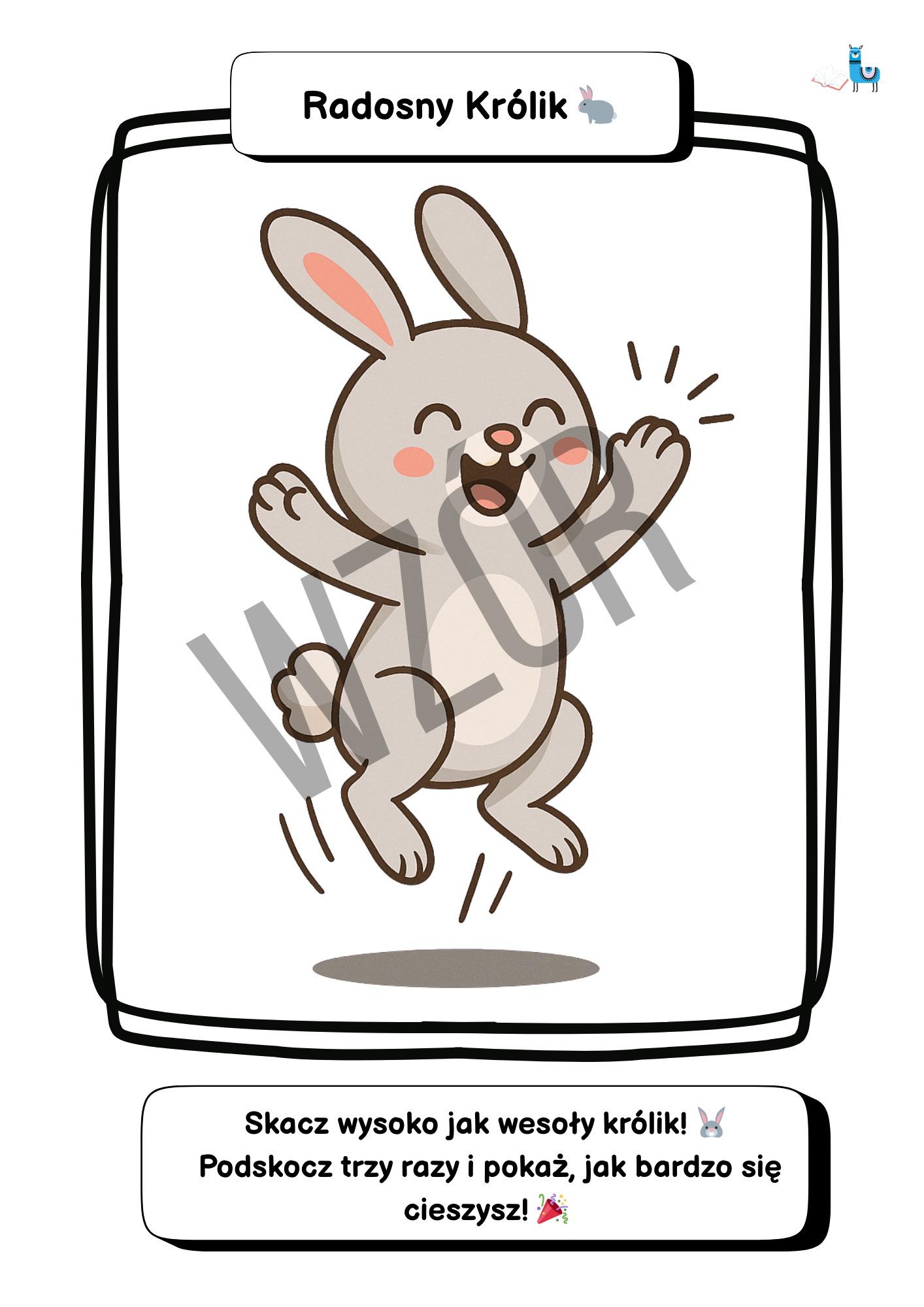 • Pod ilustracją umieszczone jest krótkie zadanie ruchowe, np. „Skacz wysoko jak królik i klaszcz trzy razy w dłonie!”.