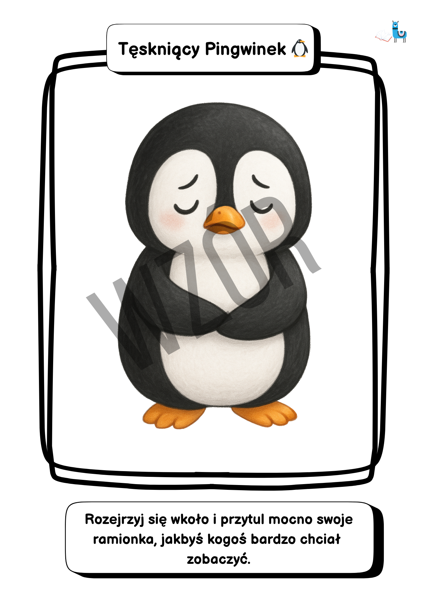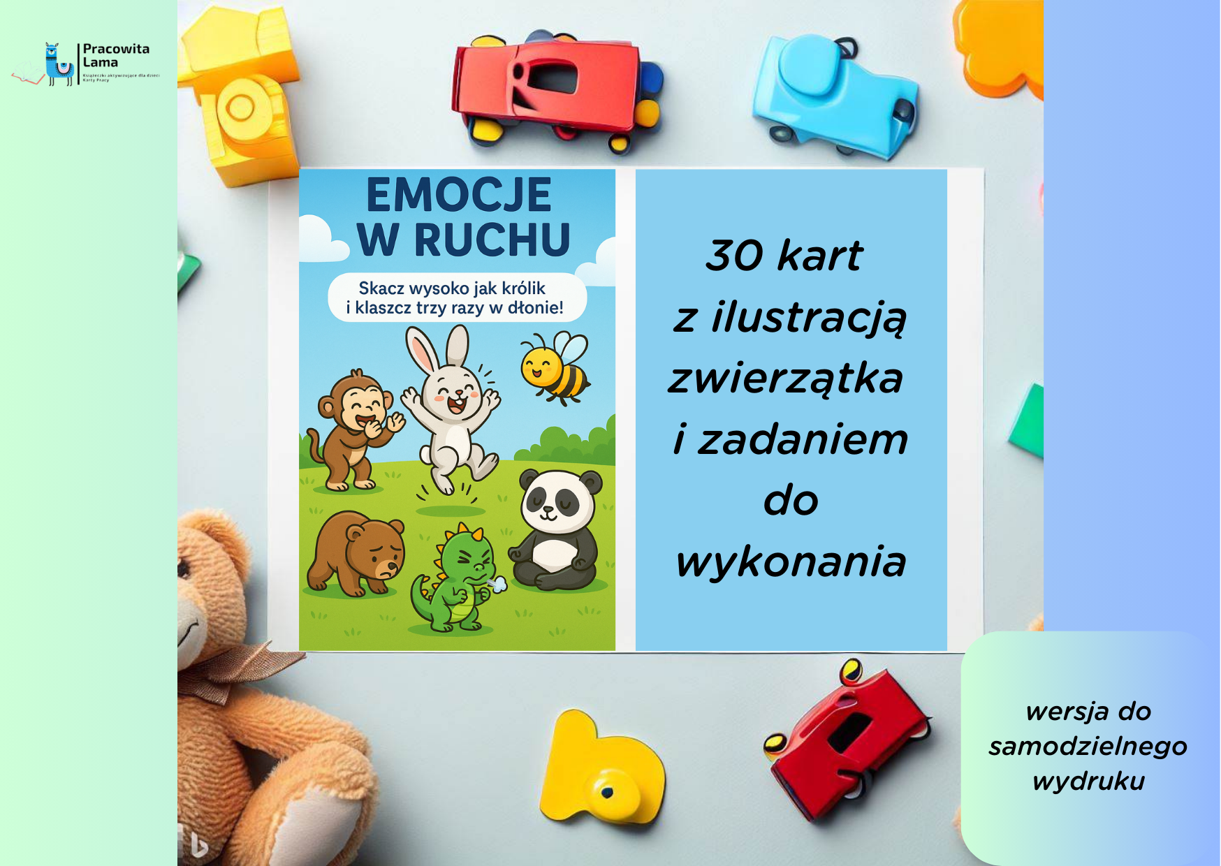 • Na każdej karcie znajduje się urocza postać-emocja (np. Radosny Królik, Złoszczek Smok, Spokojna Panda).