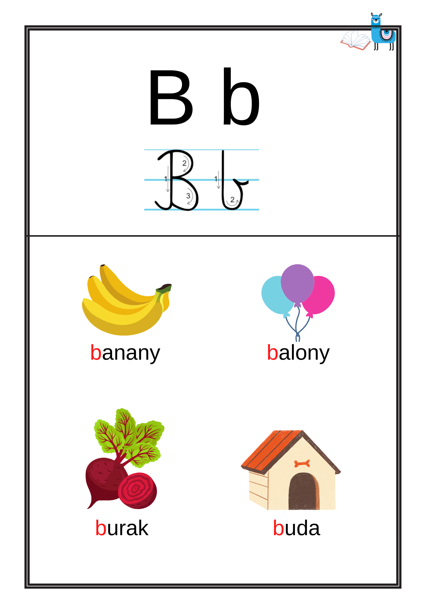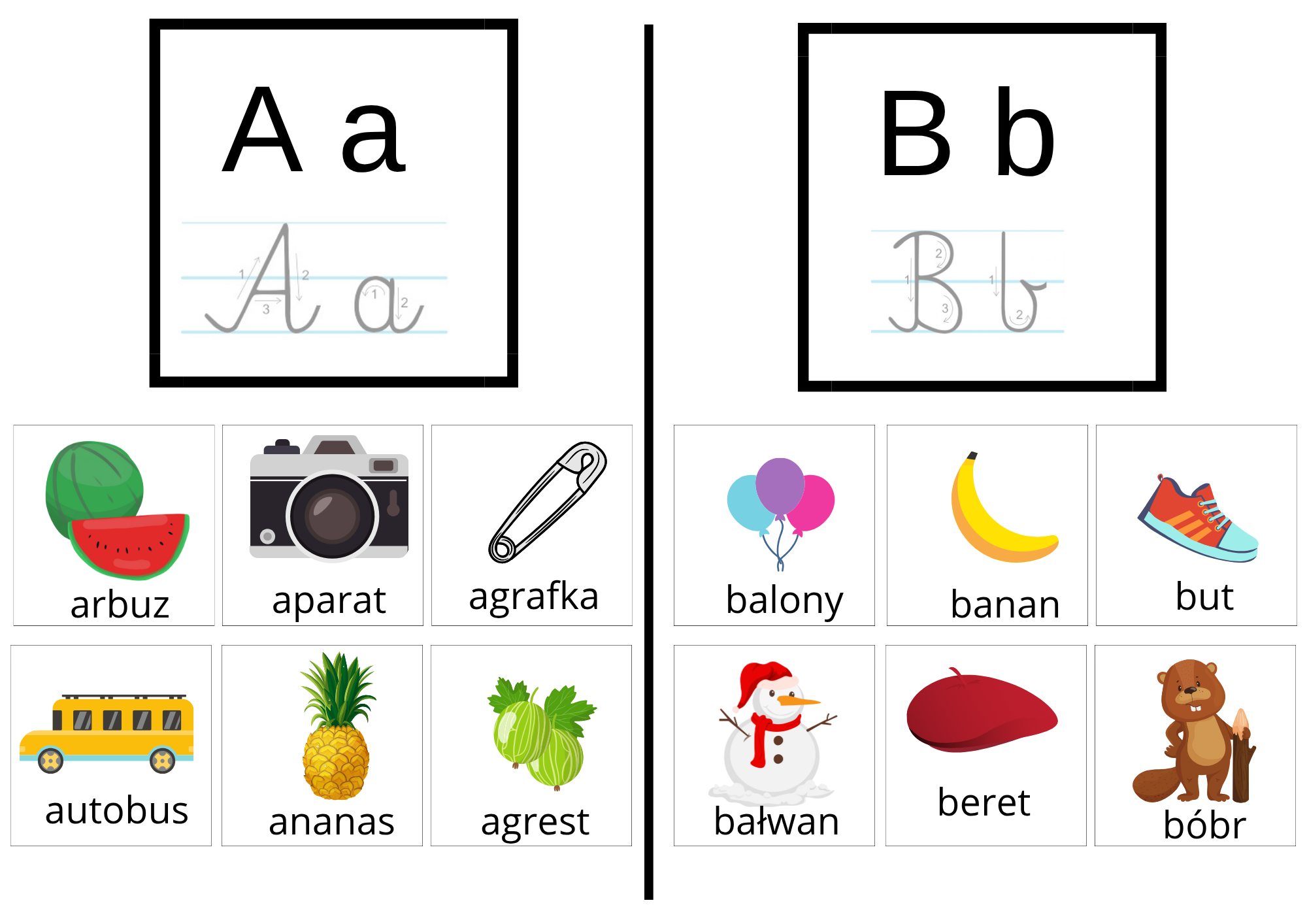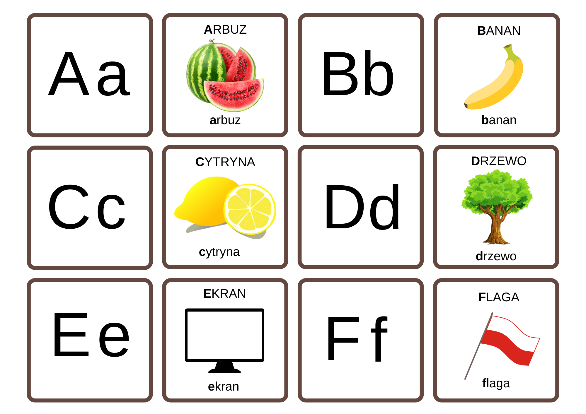 - karty pokazowe z literami – 32 karty, na każdej karcie litera z obrazkiem
