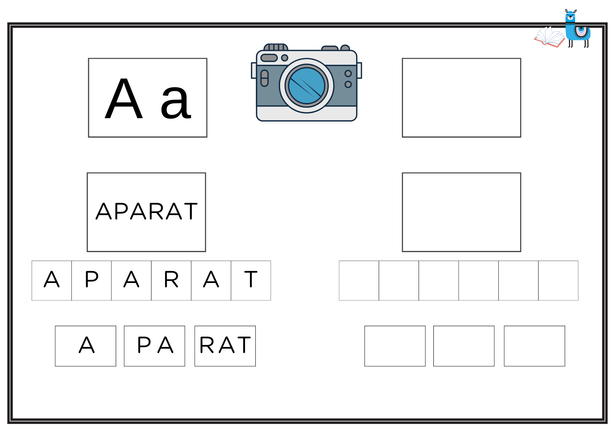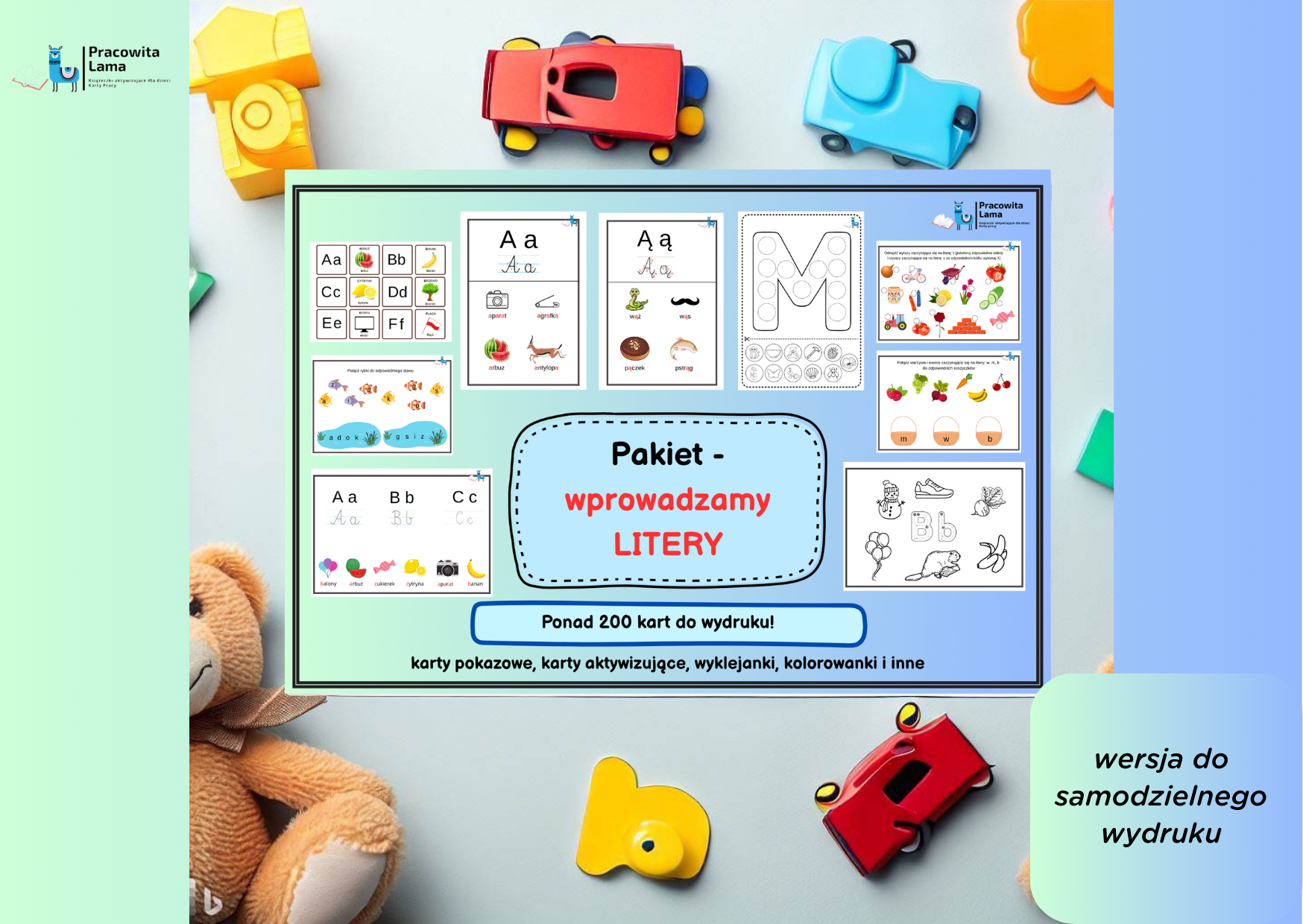 - zestaw “Literkowe wyklejanki” – zestawy kart pracy (32 karty z wielkimi literami alfabetu + 32 karty z małymi literami alfabetu): po lewej stronie każdej karty znajduje się wzór, po prawej stronie dziecko wykleja odpowiednio wyraz, litery oraz sylaby danego wyrazu; łącznie 64 karty pracy + plus 64 karty, na których znajdują się wyrazy, litery i sylaby do wycięcia i wyklejania